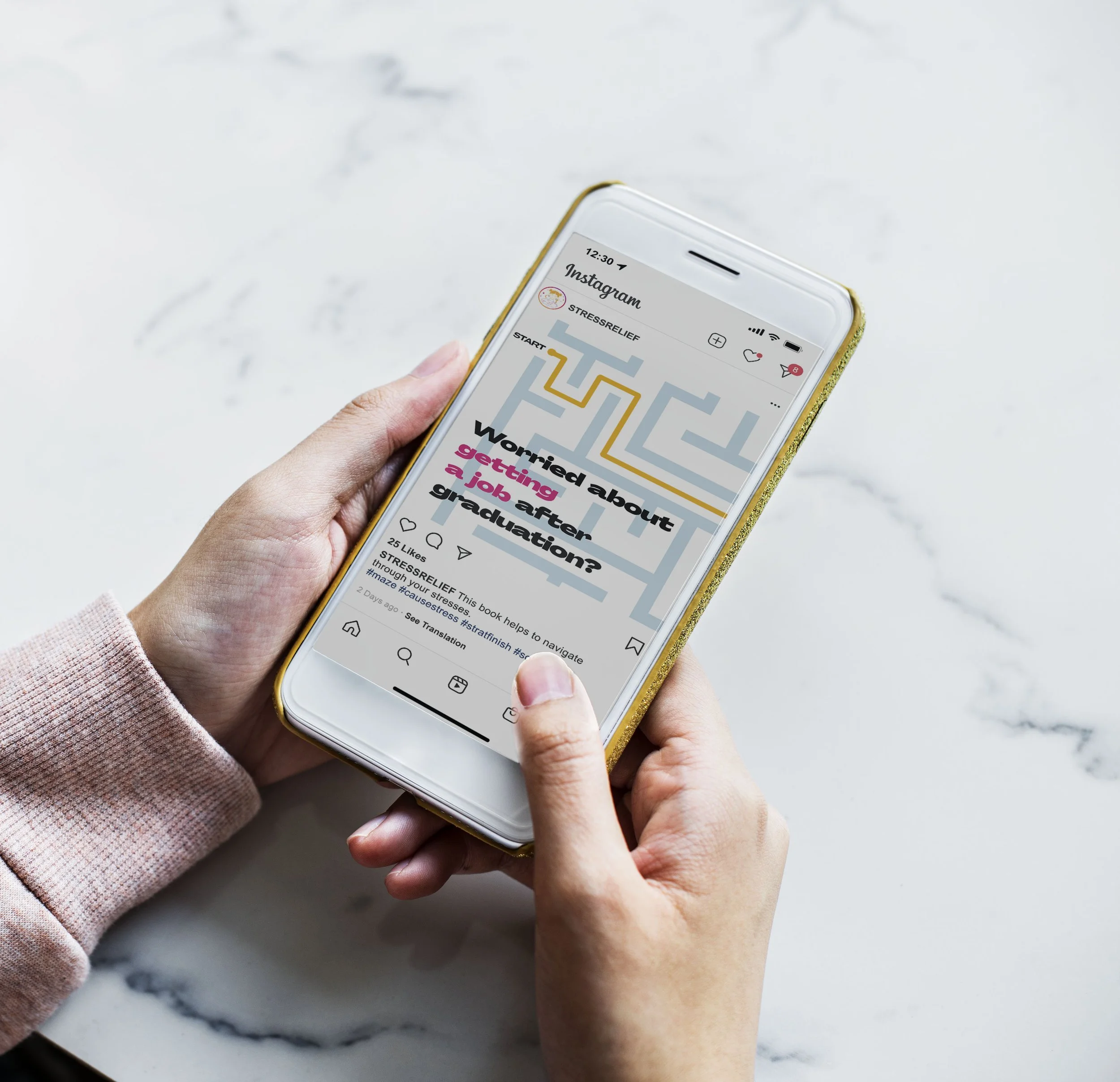 The social media posts aim to deliver uplifting and positive messages to students, reinforcing the stress-relief concept