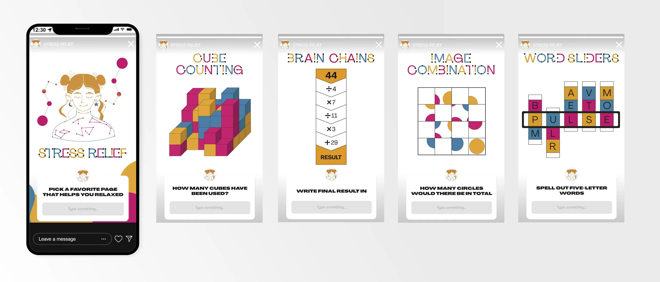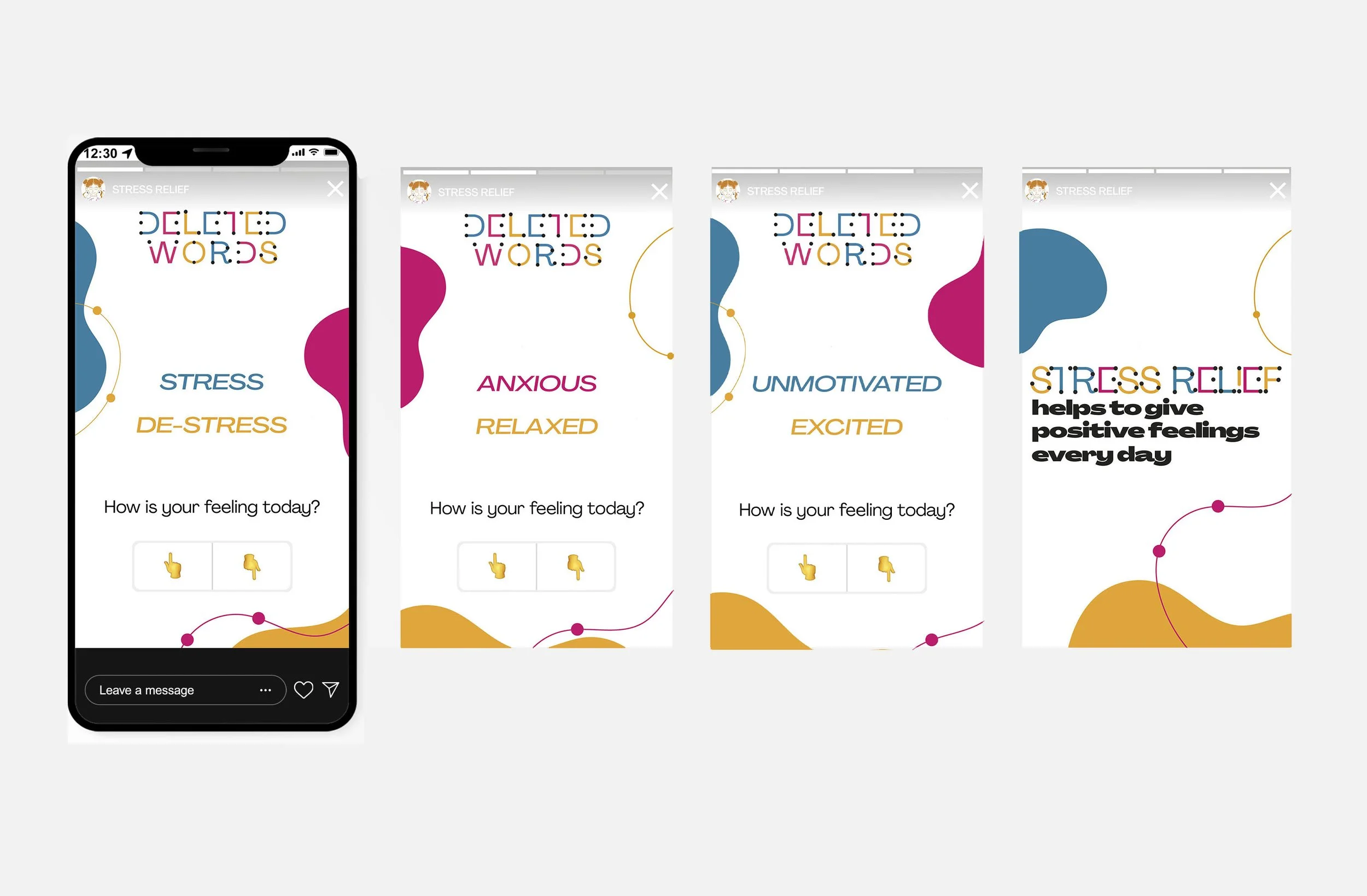 This interactive Instagram story encourages users to engage by choosing one of two words to "delete." The concept helps users reflect on their emotions and decide how they want to feel for the day. Aligned with the stress-relief theme, this post fosters self-awareness and positivity in a fun, minimalist format.